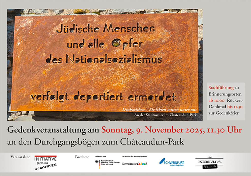 Seit November 2024 gibt es an der Innenseite der Stadtmauer im Châteaudun-Park den Gedenkort „Denkzeichen. Sie lebten mitten unter uns“, auf den Weg gebracht von der Initiative gegen das Vergessen. Sie erinnern an 75 Schweinfurter Jüdinnen und Juden, die verfolgt, deportiert und ermordet wurden.