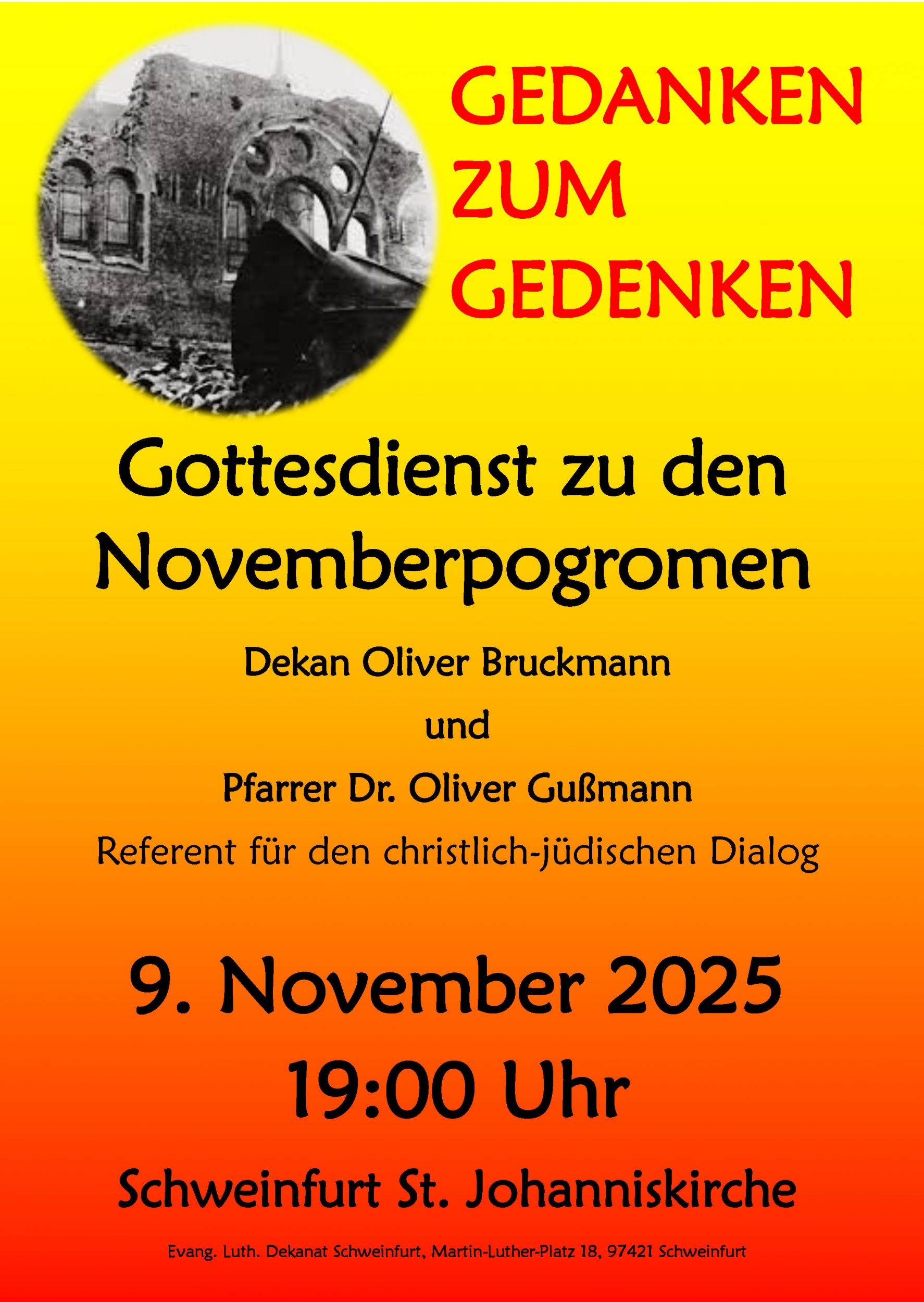 Wie in jedem Jahr, lädt das Evangelisch-Lutherische Dekanat Schweinfurt ein zu einem Gedenkgottesdienst anlässlich des Jahrestages der sogenannten Novemberpogrome am Sonntag, 9. November 2025, um 19 Uhr in der Kirche St. Johannis in Schweinfurt.