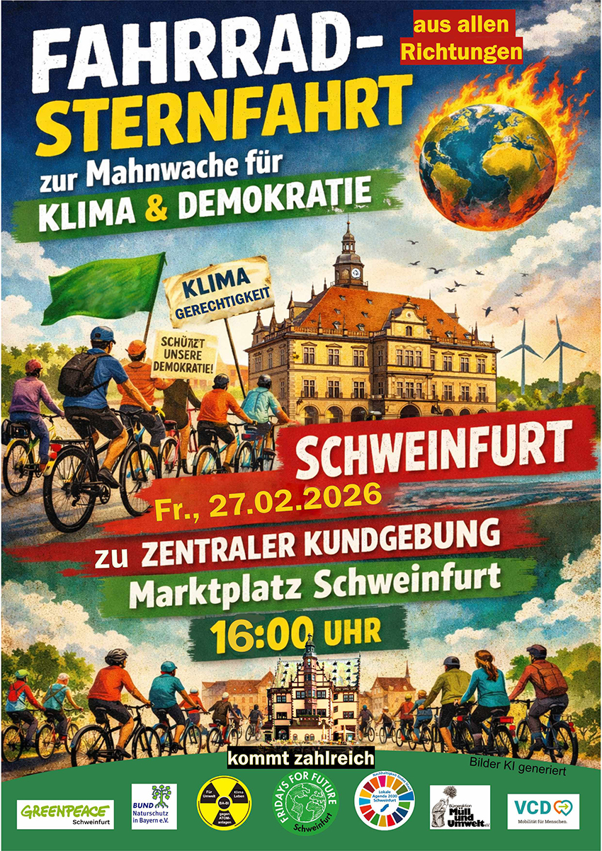 Der Aktionstag beginnt mit einer Fahrrad-Sternfahrt. Radfahrerinnen und Radfahrer sind aufgerufen, gemeinsam zum Schweinfurter Rathaus zu fahren. Die Aktion verdeutlicht die Forderung nach einer nachhaltigen Mobilitätswende und macht die Präsenz der Klimabewegung im gesamten Stadtgebiet sichtbar.